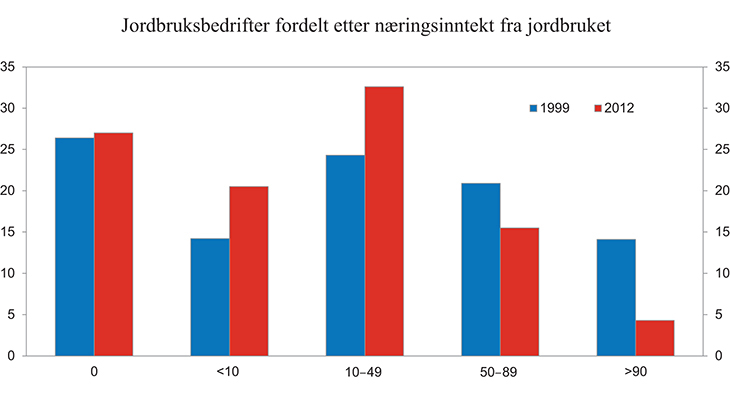 Nedgangen i sysselsettingen innebærer at grunnlaget for rent distriktspolitiske hensyn i landbrukspolitikken har endret seg. Bare i løpet av perioden 2000 – 2012 ble antall kommuner der sysselsetting i jordbruk, skogbruk og fiske utgjør mer enn 20 pst. av total sysselsetting, redusert fra 41 til 10 (Statistisk sentralbyrå 2014). Til sammen var 1 250 personer sysselsatt i primærnæringene i disse kommunene i 2012. Når det tas hensyn til at flere av kommunene først og fremst er fiskerikommuner, er det trolig mindre enn 1 000 personer som er sysselsatt i jordbruket i kommuner der jordbruket fremdeles er en dominerende yrkesvei og inntektskilde basert på definisjon ovenfor.