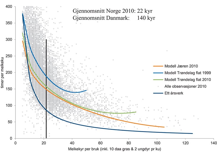 NILF ved Klaus Mittenzwei er ansvarlig for utarbeiding av modellen og regresjonsanalysen. Modellen er spesifisert som et tredjegradspolynom som forklarer arbeidsforbruk per bruk som funksjon av arealinnsats, dyretall, og geografisk plassering (8 regioner).