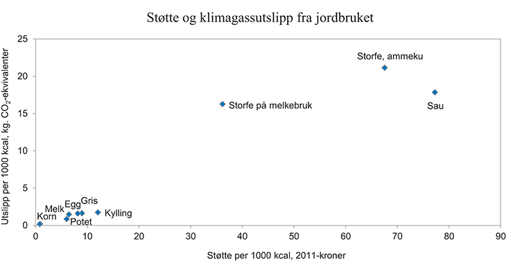 Motsetningene mellom landbrukspolitikken og klimahensyn kan illustreres ved at produksjon basert på drøvtyggere (sau, storfe, geit) både er de mest støtteintensive og de mest utslippsintensive produksjonene i norsk landbruk. I sauekjøttproduksjonen utgjør budsjettstøtten i størrelsesorden 110 kroner per kilo kjøtt , mens klimagassutslippene utgjør 26 kg CO2-ekvivalenter per kilo kjøtt. Dette er 12 ganger høyere enn tilsvarende for kylling. Samlet utslipp fra produksjon av rødt kjøtt kan anslås til vel 2 mill. tonn CO2-ekvivalenter, jf Grønlund (2013).