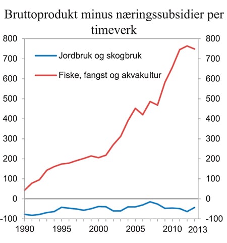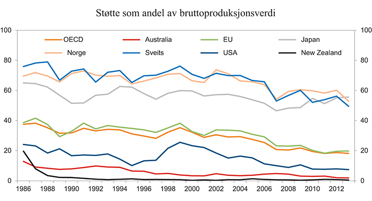 Nominelle støttebeløp sier i utgangspunktet lite om støttens virkninger på ressursallokeringen og effektiviteten i økonomien. Gaasland (2009) har ved hjelp av en generell likevektsmodell for norsk økonomi beregnet det samlede økonomiske velferdstapet som følge av landbruksstøtten og handelshindringer for norsk sjømateksport til mellom 1,2 og 2,7 pst. av BNP i 2004, tilsvarende mellom 21 og 47 mrd. kroner dette året.4 Det alt vesentlige av tapet skyldes landbrukspolitikken som gir opphav til ressursinnsats med liten eller ingen avkastning, tilskudd finansiert ved vridende skatter og tapt konsumentvelferd som følge av høye matpriser. Velferdstap som følge av et begrenset vareutvalg kommer på toppen av dette. I Perspektivmeldingen (2013) er det anslått at jordbruket genererte en negativ grunnrente på om lag 8000 kroner per innbygger i 2010. Det tilsvarer om lag 40 mrd. kroner.