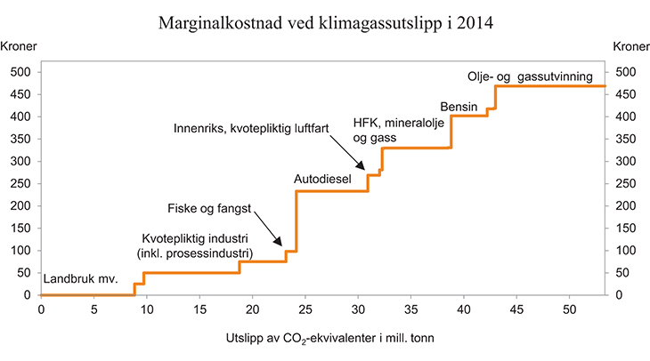 Gjennomsnittlig pris på utslipp i Norge er om lag 220 kroner per tonn CO2-ekvivalenter, men det er store variasjoner mellom utslippskildene, fra null i landbruket til om lag 470 kroner per tonn CO2-ekvivalent i petroleumssektoren. Flere utslippskilder/sektorer er også pålagt andre klimabegrunnede virkemidler. For eksempel innebærer avgiftsfritak ved kjøp av elbiler, ifølge Statistisk sentralbyrå, en gjennomsnittlig kostnad for samfunnet på mer enn 4 500 kroner per tonn sparte CO2-utslipp.