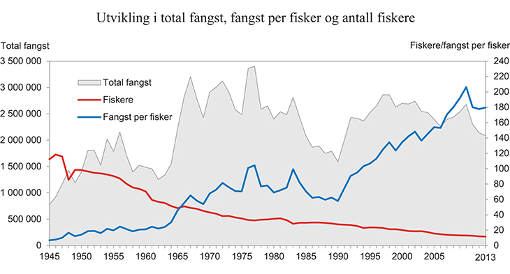 Figur 13.17 Utvikling i total fangst, fangst per fisker og antall fiskere. 1945 – 2010