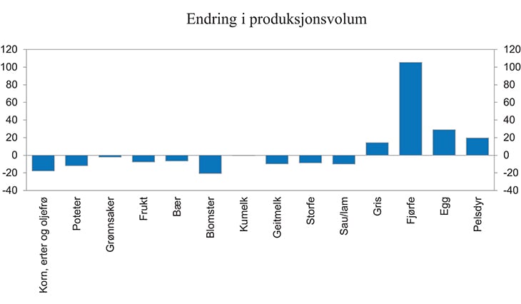 Figur 13.2 Endring i produksjonsvolum i jordbruket. 2005 – 2014. Prosent