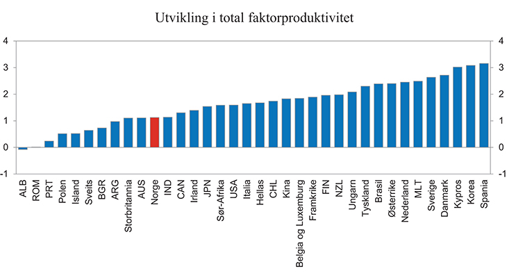 Figur 13.4 Utvikling i total faktorproduktivitet i jordbruket i utvalgte land. Gjennomsnittlig årlig endring 1991 – 2010. Prosent