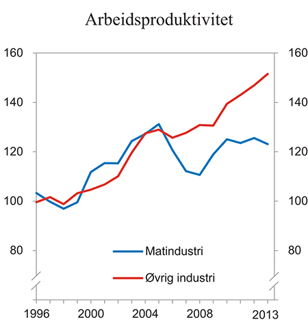 I 2012 sysselsatte norsk næringsmiddelindustri 48 600 årsverk. Om lag 35 000 var sysselsatt i virksomheter hovedsakelig basert på norske landbruksråvarer, herav knapt 1/3 i samvirkebedriftene Tine og Nortura og vel 1/3 i den såkalte RÅK-industrien som er omfattet av protokoll 3 til EØS-avtalen.6 Både antall sysselsatte og antall næringsmiddelbedrifter var om lag på samme nivå i 2012 som i 1990 (Norsk institutt for landbruksøkonomisk forskning 2013). Det generelle fallet i industrisysselsettingen har bidratt til at næringsmiddelindustriens andel av industrisysselsettingen økte fra 18 pst. i 1990 til 21 pst. i 2012. Andelen er om lag dobbelt så høy som i Sverige. Den norske matindustriens relative størrelse reflekteres også ved at industriens bruttoprodukt per innbygger i Norge er 70 pst. høyere enn i Sverige og nesten 40 pst. høyere enn i Danmark (Pettersen, 2013). Matindustriens produktivitetsutvikling har vært svak sammenlignet med annen industri etter 2005, jf. figur 13.5. Ifølge Rålm (2014) var arbeidsproduktiviteten i matindustrien 6 pst. lavere i 2013 enn i 2005. I samme periode økte arbeidsproduktiviteten i annen industri med 18 pst.
