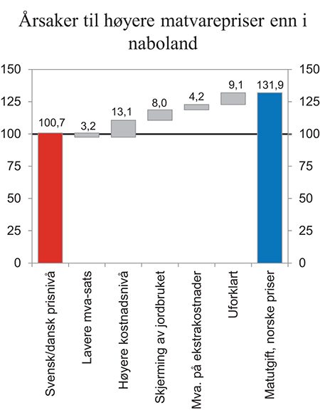 Effektivitetstapet som følge av landbrukspolitikken kan være så høyt som 40 mrd. kroner årlig. Dette er en kostnad som må avveies mot nytten av landbrukets rolle for bosettingsmønster, miljøgoder og matvareberedskap. Et særlig problem er at virkningene av importvernet og andre reguleringer på konkurranse, og på effektiviteten i næringsmiddelindustrien og dagligvarehandelen, i liten grad er kjent. Jordbruksavtalesystemet er trolig bedre egnet til å sikre bøndene en ønsket inntektsutvikling enn til å korrigere markedssvikt til nytte for samfunnet.