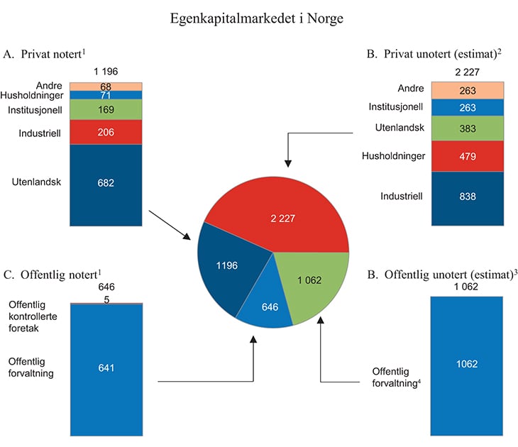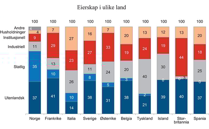 Norge er blant landene i verden med størst offentlig eierskap. Dette viser bl.a. OECDs public ownership indicator (IMF 2014). Det samme bildet tegnes i Meld. St. 27 (2013 – 2014) Et mangfoldig og verdiskapende eierskap. Det framgår der at i Norge er om lag 35 pst. av den noterte egenkapitalen (primært eierskap forvaltet av departementene) og om lag 30 pst. av den unoterte egenkapitalen offentlig eid. Figur 14.1 viser at andelen av notert egenkapital i offentlig eie er høy og at norske private investorer eier en lav andel sammenlignet med andre land.