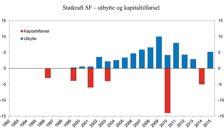 Det ser ut til å være vanskelig å komme unna den tilbakevendende diskusjonen om vekst, utbytte og kapitalinnskudd for denne typen selskaper. Dette gir lite forutsigbarhet for selskapet og en mindre forutsigbar kontantstrøm fra selskapet til statsbudsjettet. Siste kapitaltilførsel til Statkraft kom i nysalderingen av statsbudsjettet for 2014, der det ble bevilget 5 mrd. kroner til kapitaltilførsel til selskapet. Av Prop. 40 S (2014 – 2015) framgår det at staten bør bidra til finansielle rammer for selskapet som gjør at det kan videreutvikles i tråd med hovedlinjene som styret har lagt i sin strategi. Samtidig vises det til at Statkraft ble etablert som selskap gjennom utskilling av betydelige felles norske vannkraftressurser fra staten, og at det er et viktig hensyn at avkastningen fra disse ressursene tilfaller fellesskapet. For å oppnå større forutsigbarhet mener Nærings- og fiskeridepartementet at selskapets investeringer utenom nordisk vannkraft bør modnes, slik at de over tid kan bidra til inntjening, positive kontantstrømmer og finansieringsevne til konsernet. Videre mener Nærings- og fiskeridepartementet at kontantstrømmen som Statkraft genererer fra de norske vannkraftressursene bør synliggjøres tydeligere, og at det skal vurderes et eget regnskap. Kommisjonen mener dette vil være et skritt i riktig retning. Man bør også vurdere en egen langsiktig utbyttepolitikk/utbytteforventning som tydeliggjør hvordan eier ønsker at overskuddet fra den norske vannkraften skal forvaltes. Alternativt kan man vurdere en løsning der eierskapet til de norske vannkraftverkene skilles fra det øvrige eierskapet, for eksempel etter modell av Statens direkte økonomiske engasjement (SDØE) i petroleum.