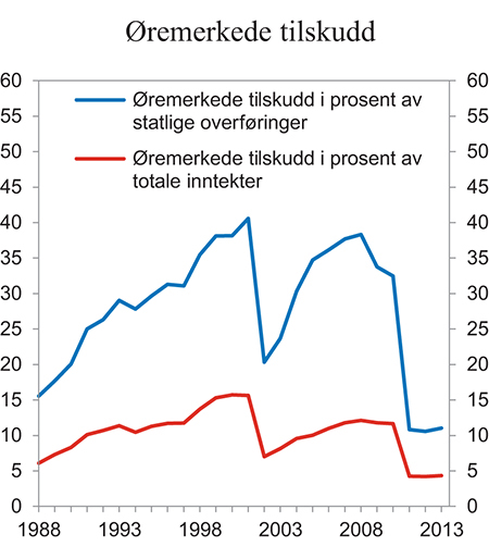 Øremerkede midler som andelen av kommunesektorens samlede inntekter er i 2014 på 5 pst., som er lavt sammenlignet med tidligere. Også etter innføringen av inntektssystemet i 1986 har det vært et betydelig antall øremerkede tilskudd. Det samlede omfanget har variert over tid. I perioden 1987 – 2001 skjedde det en gradvis økning i øremerkingen, se Borge (2010). De øremerkede tilskuddene økte fra 5 pst. av inntektene i 1987 til noe over 15 pst. rundt årtusenskiftet. I 2002 ble andelen halvert som følge av at staten overtok ansvaret for sykehusene, en tjeneste med høy grad av øremerking på grunn av innsatsstyrt finansiering (ISF). Deretter økte øremerkingen igjen, først og fremst som følge av barnehagereformen som ble finansiert gjennom øremerkede tilskudd. Da barnehagene ble rammefinansiert fra 2011, ble andelen øremerkede tilskudd betydelig redusert, jf. figur 16.5.