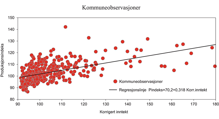 Figur 16.6 viser at kommuner med høye inntekter gjennomgående har et bedre tjenestetilbud enn kommuner med lavere inntekter, men også at det er stor spredning mellom kommuner på samme inntektsnivå. Det er en indikasjon på forskjeller i effektivitet. Borge m.fl. (2008) bruker forholdet mellom en produksjonsindeks for kommunale tjenester og frie inntekter inkl. eiendomsskatt og konsesjonskraftinntekter, og korrigert for variasjoner i kommunenes utgiftsbehov, som indikator på effektivitet. Med utgangspunkt i denne indikatoren anslås potensialet for effektivisering til opp mot 30 – 35 pst. for kommuner med lav effektivitet dersom de utnytter ressursene like godt som de mest effektive kommunene.