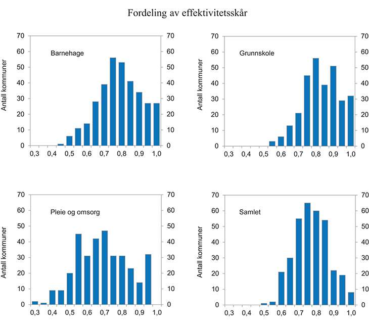 Figur 16.7 Fordeling av effektivitetsskår1 i barnehage, grunnskole, pleie og omsorg og samlet. 2013