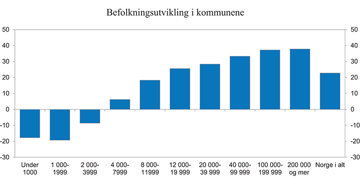 Folketallet i Norge har økt med 32 pst. siden 1970 og 22 pst. siden 1985. Bosettingsmønsteret har også endret seg betydelig. Økningen i folketallet har vært størst i de store kommunene, mens det har falt i kommuner som nå har under 4 000 innbyggere, jf. figur 16.8. En stadig større andel av befolkningen lever i eller nær større bysentra. Alderssammensetningen av befolkningen varierer også mye mellom kommunene. Typisk har små kommuner en høyere andel eldre enn store kommuner.