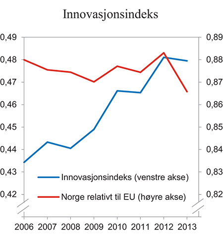 Norsk innovasjonsevne, målt ved EUs samleindeks for innovasjon, har vært økende siden 2008, jf. figur 5.1. For å kunne vurdere et lands innovasjonsevne nærmere er det nødvendig å gå nærmere inn på indikatorene som ligger bak. Den relative prestasjonen sammenlignet med gjennomsnittet for EU-landene har imidlertid vært relativt stabil over tid.