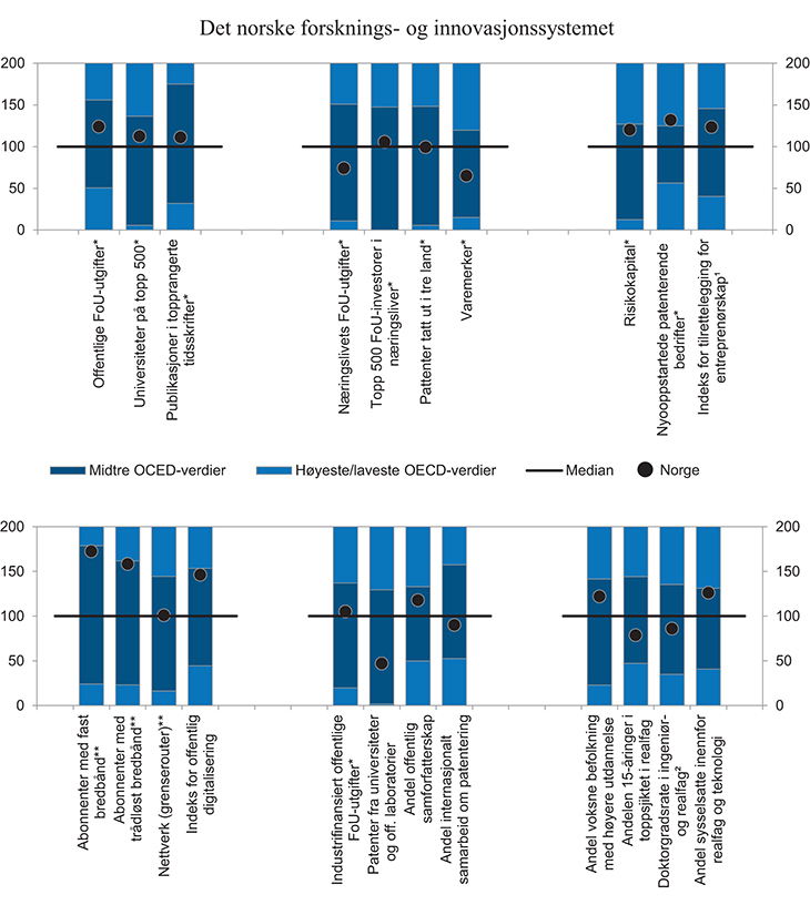 OECD STI antyder en relativt lav innovasjonsaktivitet i Norge. Det pekes på at Norges produktivitetsutvikling isolert sett skulle tilsi en høyere innovasjonsaktivitet enn hva data for utgifter til FoU tyder på. Dette henger trolig i noen grad sammen med den norske næringsstrukturen, men det forklarer ikke alt. OECD har i sitt STI Scoreboard gjort et forsøk på å korrigere for næringssammensettingen, og Norges posisjon endres da fra en 18. plass av 24 land til en 11. plass. Finne (2011) viser i tillegg at norske bedrifter underrapporterer FoU-investeringer, særlig blant underleverandørene til olje- og gassektoren. Studien slår likevel fast at ulik næringsstruktur trolig slår sterkere ut for de norske resultatene enn denne underrapporteringen. For patenter er det i tillegg problemer med de norske dataene som trolig bidrar til at tallene for Norge er undervurdert. Kapittel 9 går nærmere inn på bakgrunnen for det relativt lave FoU-nivået i norske bedrifter og hvorvidt dette kan bidra til å svekke vekstevnen i økonomien.