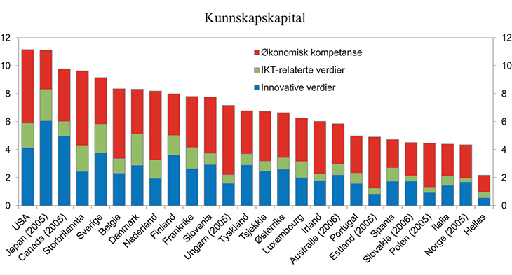 Figur 5.3 viser OECDs anslag for hovedkomponentene i kunnskapskapital for et utvalg land. Norge rangeres svært lavt i oversikten, bare slått av Hellas. Her må det pekes på at det er vanskelig å vurdere hvor gode anslagene er. Metodene for verdsetting er usikre og under utvikling, og de anvendte anslagene til dels er relativt gamle.
