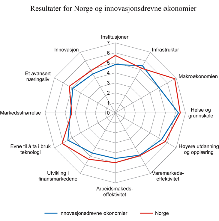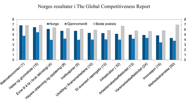 For hver underindikator gis landene en skår mellom én og syv, der syv er beste mulige resultat. Figur 5.4 illustrerer hvor langt de norske resultatene er fra beste praksis og gjennomsnittet på hvert enkelt område. Her er indikatorene rangert fra venstre til høyre etter den norske skåren på området. Figuren illustrerer at Norge skårer bedre enn gjennomsnittet for alle undergruppene. Figur 5.5 sammenligner Norges resultater med gjennomsnittet for innovasjonsdrevne økonomier. Som figurene illustrerer, gjør Norge det gjennomgående godt. På mange områder ligger Norge svært nær beste praksis, og også bedre enn gjennomsnittet for andre innovasjonsdrevne økonomier. Norge gjør det spesielt godt på indikatoren for tilstanden i makroøkonomien, der Norge rangeres som nummer én. Ifølge rapporten kjennetegnes Norge av velfungerende og transparente offentlige institusjoner. Norge kommer derimot dårlig ut på byrden av offentlig regulering. Her kommer Norge på en 38. plass med en skår på 3,8 av 7. Næringslivslederne har her blitt spurt om hvor stor byrde det er for bedriften å etterkomme offentlige administrative krav som tillatelser, reguleringer og innrapporteringer.