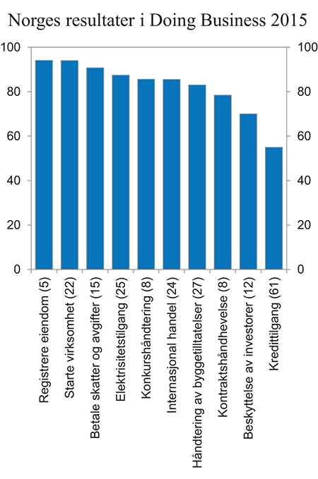 I spørreundersøkelsen som ligger til grunn for rapporten blir næringslivslederne bedt om å velge de fem områdene de ser på som mest problematiske for å drive næringsvirksomhet og rangere disse mellom én (mest problematisk) og fem. For Norge skårer arbeidsmarkedsreguleringer, skatt, utilstrekkelig innovasjonskapasitet, utilstrekkelig tilbud av infrastruktur og et lite effektivt offentlig byråkrati høyest. Over 18 pst. av næringslivslederne mente arbeidsmarkedsreguleringer er et viktig hinder for å drive næringsvirksomhet i Norge. Resultatene fra undersøkelsen i Sverige og Danmark viser at det er mange av de samme faktorene som kommer høyt opp. Også i våre naboland vurderer næringslivsledere at det offentlige byråkratiet er et vesentlig hinder for å drive næringsvirksomhet. Undersøkelser som sammenligner byråkratiske prosesser mellom land, for eksempel skatteadministrasjon og oppstart av virksomheter, gir imidlertid et langt lysere bilde av norsk offentlig byråkrati.
