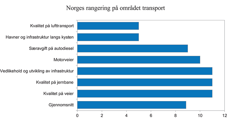 Norge kommer også dårlig ut på infrastruktur, med en skår på 5,2, og en 32. plass totalt. Her er gjennomsnittet for innovasjonsdrevne økonomier om lag 5,4. Norge kommer særlig dårlig ut på kvaliteten på veiene, med en 74. plass og en skår på 3,9, som er dårligere enn land som Malaysia, Namibia, Rwanda, Sri Lanka, Gambia og Aserbajdsjan. Dette resultatet må ses på bakgrunn av at undersøkelsen er basert på subjektive vurderinger. Som nevnt innledningsvis vil trolig norske næringslivsledere ha andre forventninger til kvaliteten på veiene i Norge enn hva tilfellet er for en del av landene som kommer høyere opp på denne indikatoren, men det er også flere vestlige land som skårer høyt på denne indikatoren. De Arabiske Emirater, Portugal og Østerrike kommer best ut på indikatoren for kvalitet på veiene. Som for de øvrige resultatene i spørreundersøkelsen er det vanskelig å bruke rangeringene som et objektivt mål på hvilke systemer som gir et best grunnlag for vekst. Indikatorene kan likevel gi et bilde av hvilke vurderinger næringslivslederne i undersøkelsen gjør av hvor viktig styrket infrastruktur er for å gjøre økonomien mer konkurransedyktig. I denne sammenheng er det relevant å merke seg at en bedre infrastruktur er et av områdene norske næringslivsledere vurderer som et hinder for å drive næringsvirksomhet i Norge. Dette bekreftes også av IMD-undersøkelsen som omtales under.