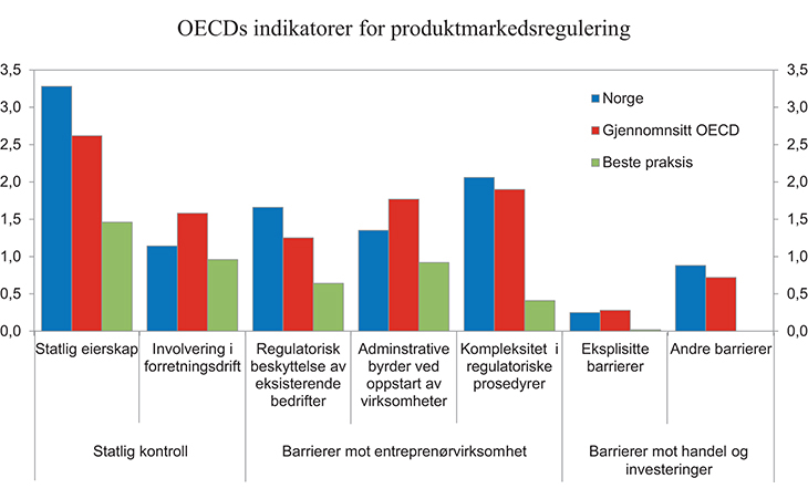 I forbindelse med arbeidet med Going for Growth utarbeider OECD indikatorer for produktmarkedsreguleringer (PMR). PMR-indikatorene oppdateres hvert femte år, og den siste oppdateringen er fra 2013. Indikatorene sammenstilles på bakgrunn av et omfattende spørreskjema som sendes ut til alle medlemslandene og BRIICS-landene.12 Indikatorene skal illustrere hvordan offentlige reguleringer begrenser konkurransen i ulike sektorer, som nettverksindustrier (energi, telekommunikasjon og transport), forretningsmessig tjenesteyting (advokater, arkitekter, revisorer mv.) og detaljhandel. Reguleringer av industrien er ikke omfattet. Indikatorene tar ikke sikte på å måle kostnadene av ulike reguleringer, men snarere å peke på reguleringer som kan virke begrensende for etableringer og/eller konkurransen i disse markedene. Norge kommer ut nær OECD-gjennomsnittet for indikatorene sett under ett.