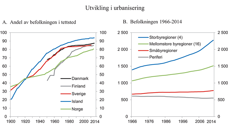 Figur 7.1a viser at Norge har hatt en avvikende urbaniseringsprosess i løpet av 1900-tallet sammenlignet med særlig Sverige, Danmark og Island. Urbaniseringen gikk spesielt sakte i Norge i mellomkrigstiden. Dette utsatte urbaniseringen i Norge sammenlignet med våre naboland med flere tiår. Sverige og Danmark nådde en tettstedsandel på godt over 80 pst. allerede på 1960-tallet. Norges urbanisering har dessuten vært mer avdempet i etterkrigstiden, og vi har nå den laveste urbaniseringsgraden i Norden. Mye av denne forskjellen kan også tilskrives ulik politikk, der Norge har forsøkt å bremse sentraliseringen gjennom en sterkere regional utviklingspolitikk (Bütikofer m.fl. 2014).