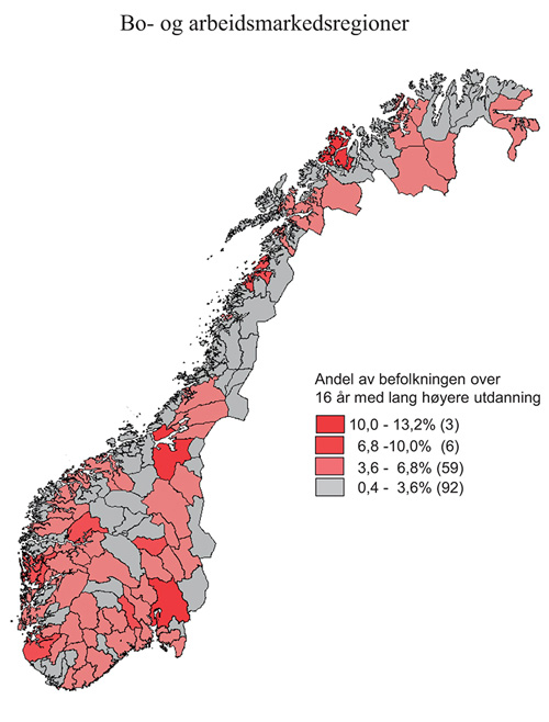 Tendensen til konsentrasjon av utdanningskompetanse, ser man enda tydeligere hos de med lang høyere utdanning (over fire år). Figur 7.4 viser en klar konsentrasjon i de større byområdene.