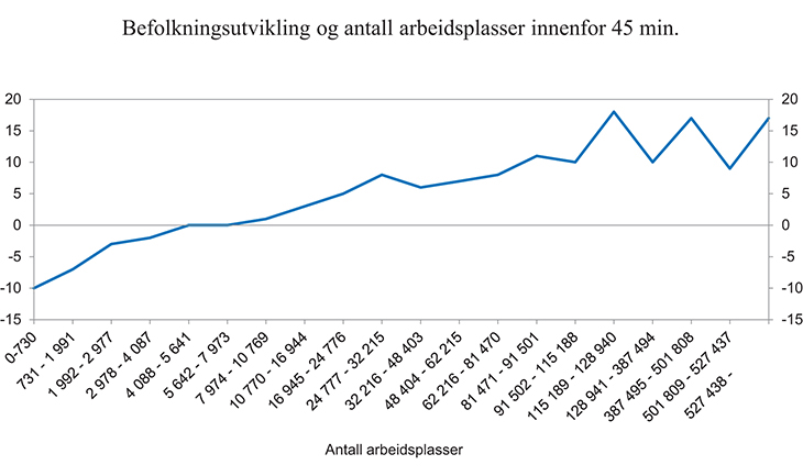 Engebretsen og Gjerdåker (2012) viser at det er en sammenheng mellom befolkningsutvikling og tilgang på arbeidsplasser innenfor 45 minutters reisetid (akseptabel daglig pendlingsavstand). I områder i Norge som i dag har under 4 000 arbeidsplasser, har det vært betydelig nedgang i bosettingen, jf. figur 7.5. Områder med 4 000 – 10 000 arbeidsplasser har vært preget av stagnasjon, mens større områder enn dette har hatt vekst. Befolkningsveksten har vært særlig stor i områder der det er mer enn 100 000 arbeidsplasser innenfor 45 minutters reisetid.18