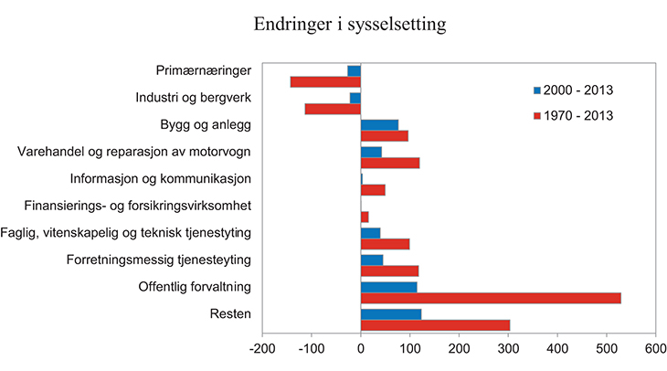Figur 8.1 Endring i sysselsetting i periodene 1970 – 2013 og 2000 – 2013. 1 000 personer