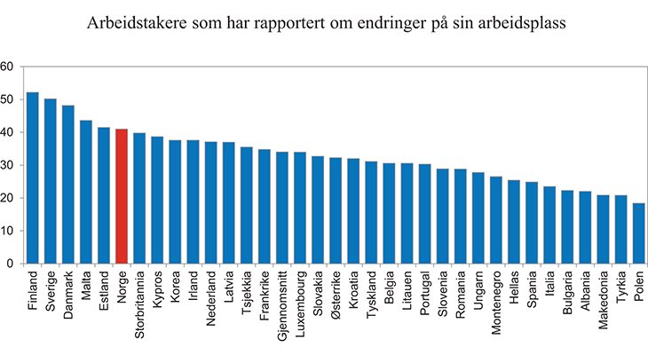 OECDs Skills Outlook fra 2013 viser at norske bedrifter og arbeidstakere omstiller seg raskt. Figur 8.10 viser andelen ansatte som i 2011 rapporterte at deres arbeidsplass hadde vært gjennom en substansiell restrukturering eller omorganisering de siste tre årene. Målt på denne måten er de fire nordiske landene bland landene med høyest omstillingstakt. I Norge har hele 41 pst. av de ansatte opplevd organisatoriske endringer de siste tre årene, og innføring av ny teknologi skjer raskt. Ifølge OECD-undersøkelsen rapporterte 48 pst. av norske arbeidstakere at de hadde opplevd innføring av en ny produksjonsprosess eller teknologi de siste tre årene.