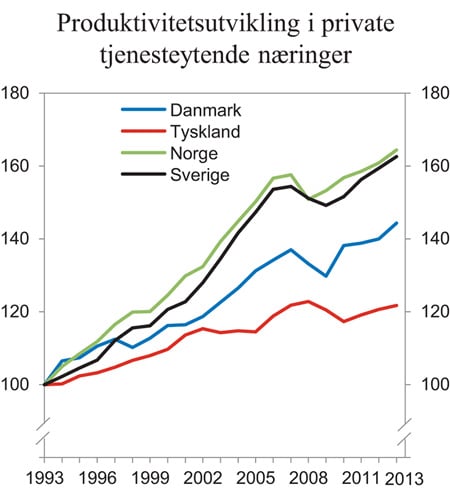 Veksten i produktiviteten i privat tjenesteyting i Norge de siste tiårene har vært om lag på linje med utviklingen i Sverige, men klart høyere enn i Danmark og Tyskland, jf. figur 8.4.