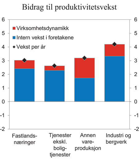 Figur 8.5 illustrerer at virksomhetsdynamikk bidrar positivt til produktivitetsutvikling, men at det er forskjeller i størrelsen på dette bidraget mellom næringer. Bidraget fra virksomhetsdynamikk oppstår ved at nyetablerte foretak i gjennomsnitt er mer produktive enn foretakene som avvikles. Den interne veksten i foretakene bidrar imidlertid til over to tredeler av den samlede produktivitetsveksten i fastlandsnæringene. Dette tyder på at det skjer vesentlige endringer internt som øker foretakenes produktivitet.