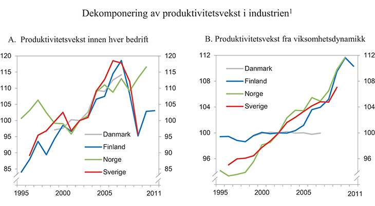 Kauhann og Maliranta (2014) sammenligner konkurranseevne og arbeidsproduktivitet i industrien for de nordiske landene fra 1995 til 2010, jf. figur 8.6. De finner at produktivitetsveksten oppstår både som følge av forbedringer innen virksomhetene og fra reallokering fra mindre til mer produktive virksomheter. Norge skiller seg fra de andre nordiske landene med en betydelig høyere produktivitetsvekst ved slik reallokering. Dette stemmer godt med figur 8.5.