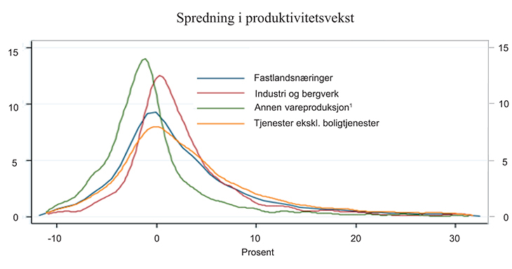 Figur 8.7 viser spredning i produktivitetsutviklingen mellom foretak i samme næring i perioden 1995 til 2012. Som figuren viser har den gjennomsnittlige årlige produktivitetsveksten vært konsentrert rundt null for de fleste næringene, men det har vært varierende grad av spredning i de ulike næringene. Halene til venstre viser gruppen foretak som har hatt en gjennomsnittlig negativ produktivitetsutvikling, mens halene til høyre viser foretakene som har hatt en gjennomsnittlig positiv produktivitetsutvikling. Jo lenger halen mot høyre er, desto flere foretak har hatt en positiv produktivitetsutvikling. Noen, men relativt få, foretak, har hatt en svært høy produktivitetsvekst og på den måten bidratt til å trekke opp den samlede veksten. Den delen av produktivitetsutviklingen som skyldes at eksisterende foretak legges ned og nye etableres er ikke fanget opp i figur 8.7.
