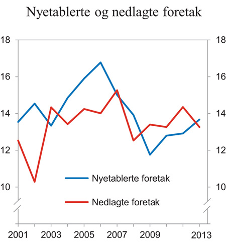 I 2013 ble det etablert i overkant av 50 000 nye foretak i Norge, som utgjør om lag 13 pst. av alle foretak, jf. figur 8.8. Figuren viser at det var en topp av nyetableringer i 2006, da nyetableringer sto for 17 pst. av alle foretak, og en bunn i 2009 da nyetableringer sto for 12 pst. av alle foretak. Antall nyetableringer lå høyere enn antall nedleggelser i årene fra 2001 til 2007, med unntak av 2003. I årene etter finanskrisen var det imidlertid flere foretak som ble nedlagt enn etablert. Etter hvert ser denne trenden igjen ut til å ha snudd.