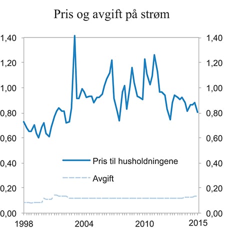 Figur 6.20 Pris (inkl. nettleie og avgifter) og avgift på elektrisk kraft for husholdninger 1. kvartal 1998–2. kvartal 2015. 2015-kroner per kWh