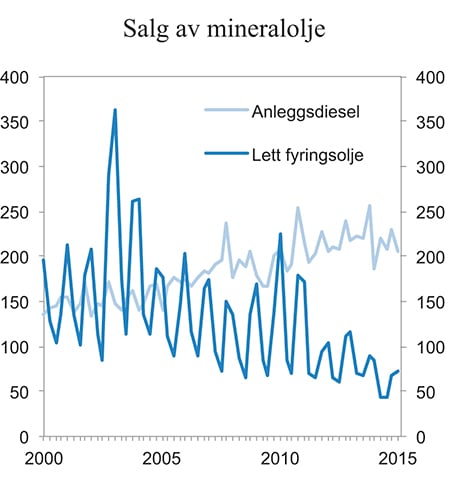 Ordinær avgiftssats i 2015 er 1,59 kroner per liter mineralolje. Treforedlingsindustrien og produsenter av fargestoffer og pigmenter betaler redusert sats med 0,126 kroner per liter mineralolje. Det gis avgiftsfritak til en rekke formål, særlig innen sjøfart og industri. Figur 6.21 viser at salget av mineralolje omfattet av grunnavgiften fordelte seg nokså likt mellom anleggsdiesel og lett fyringsolje da avgiften ble innført. I dag står imidlertid anleggsdiesel for over to tredeler av avgiften. Det skyldes blant annet at bruken av fyringsolje har blitt redusert betydelig, delvis som følge av perioder med høye priser på fyringsolje, samt støtteordninger til utskifting av oljefyringsanlegg og strengere byggeforskrifter.