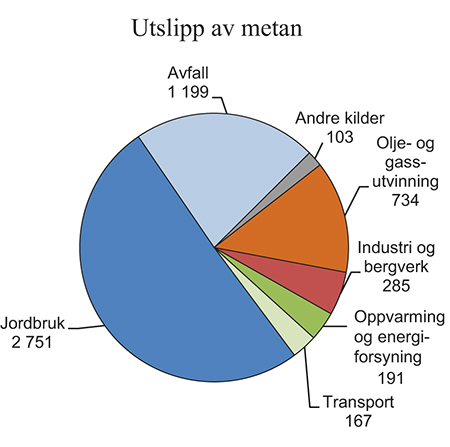 Menneskeskapte utslipp av metan i Norge kommer hovedsakelig fra husdyrhold, avfallsfyllinger og olje- og gassutvinning, se figur 7.1. Disse kildene står for i underkant av 90 pst. av de samlede metanutslippene i Norge. Utslippene av metan utgjorde om lag 5,4 mill. tonn CO2-ekvivalenter i 2013. Disse utslippene er, med unntak av metanutslipp i petroleumssektoren, ikke regulert gjennom avgifter eller kvoter. For omtale og vurdering av CO2-avgiften på utslipp av naturgass (metan) i petroleumssektoren vises det til punkt 6.2.