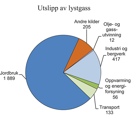 Over to tredeler av utslippene av lystgass kommer fra jordbruk. Mineralgjødsel (kunstgjødsel) og husdyrgjødsel bidrar hver med om lag 30 pst. av lystgassutslippene fra jordbruket, mens avrenning av nitrogen og utslipp fra dyrket myr bidrar med om lag 15 pst. hver. I tillegg er det enkelte andre mindre kilder til lystgassutslipp i jordbruket, blant annet fra restavlinger og utslipp av ammoniakk. 14 pst. av de samlede lystgassutslippene (om lag 0,4 mill. tonn CO2-ekvivalenter) kommer fra produksjon av mineralgjødsel, jf. figur 7.2. Utslippstallene for lystgass er svært usikre.
