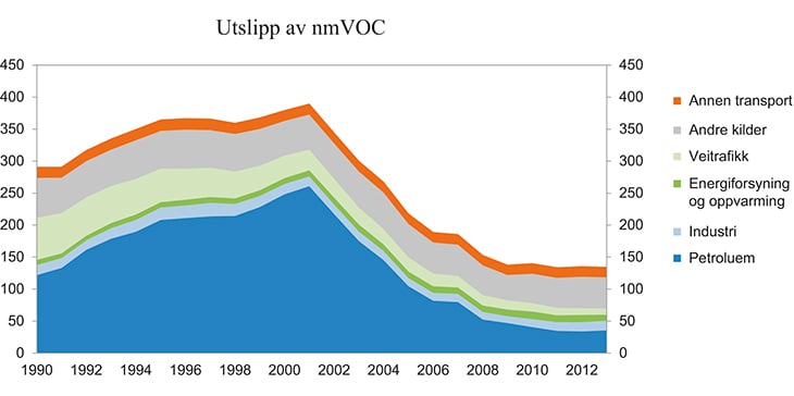 Størsteparten av utslippene av nmVOC i petroleumssektoren skjer i forbindelse med lasting og lagring av olje. Det er også utslipp fra kaldventilering og lekkasjer. Kildene til utslipp er mange og små. Utslippene måles ikke, men estimeres basert på utslippsfaktorer som vurderes som usikre.