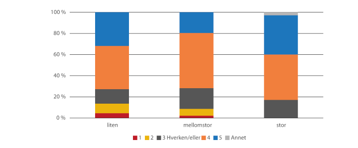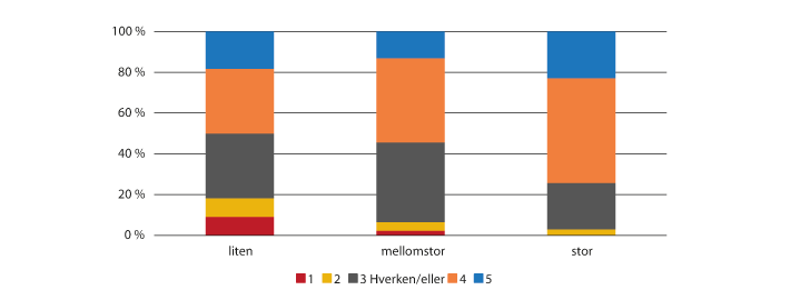 Utvalgets undersøkelse viser at den faglige kunnskapen er større i de store kommunene. Av respondenter fra store kommuner svarte 74 prosent at de har stor faglig kunnskap, besvart som 4 eller 5 i figur 5.2, sammenliknet med henholdsvis 54 og 50 prosent for de mellomstore og små kommunene.