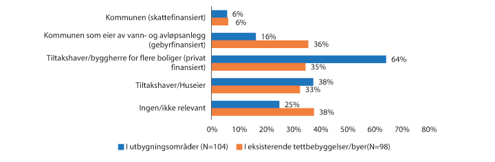 Kommuneundersøkelsen til utvalget viser ellers at en stor del av overvannsanleggene blir gjennomført av utbygger ved nybygging. Kommunen som eier av vann- og avløpsanlegg står for en liten andel av de lokale overvannstiltakene i utbyggingsområdene (16 prosent), og en større andel i eksisterende tettsteder og byer (36 prosent). For både ny og eksisterende bebyggelse står tiltakshaver/huseier for en stor del av tiltakene (se figur 5.4). Tendensen er at det langt på vei er opp til private aktører å etablere anlegg for lokal overvannshåndtering.