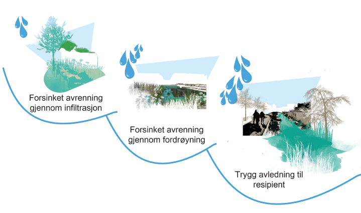 Å bruke overvann som ressurs betyr at «overvann skal infiltreres, fordrøyes og brukes lokalt der det er praktisk mulig, og at vi bruker åpne, naturlige og flerfunksonelle fordrøyningssystemer.»