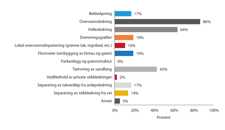 Figur 1.11 Andel av kommuner som bruker vann og avløpsgebyrer for å finansiere forskjellige overvannstiltak