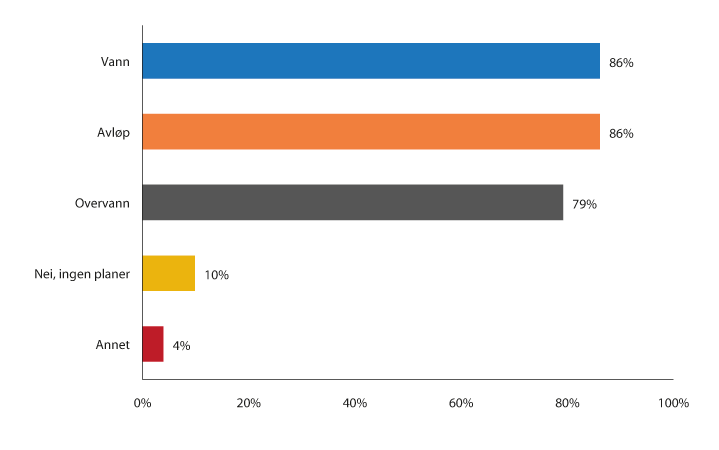 De aller fleste av respondentene arbeider innen vann og avløp (96 prosent). Særlig i de små og mellomstore kommunene viser undersøkelsen at respondentene arbeider innen flere fagfelt, som planlegging (15 prosent), byggesak (5 prosent), samferdsel (33 prosent) og grøntanlegg og bymiljø (22 prosent).