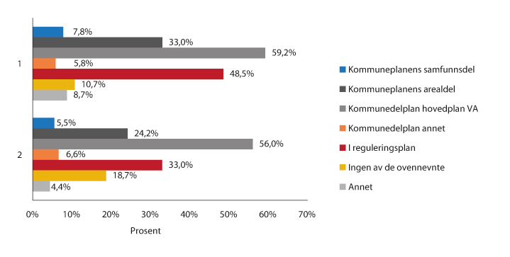 Planer med prinsipper for overvannshåndtering (infiltrasjon, fordrøying, trygge flomveier, sammenhengende grønnstruktur, separering av fellesledning, utforming av terreng osv. 1) for utbyggingsområder og 2) for eksisterende bebyggelser/byer. Antall respondenter: 107 respektive 103.