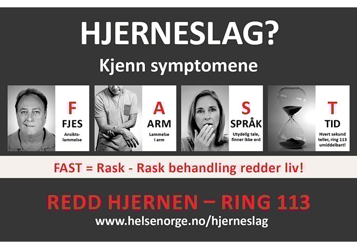 Akuttutvalget mener at opplysningskampanjer som den tidligere omtalte kampanjen i England (jf. kapittel 13.3) kan være et eksempel for etterfølgelse i Norge. Her ble FAST-akronymet brukt, og dette akronymet er også i bruk i de fleste engelsktalende land. Det finnes også flere andre gode akronymer i bruk for å beskrive symptomatologien ved slag (f.eks. SOS og SLAG), men det er akuttutvalgets oppfatning at det bør velges et nasjonalt akronym – ikke minst når det planlegges brukt i undervisningsøyemed og opplysningskampanjer.