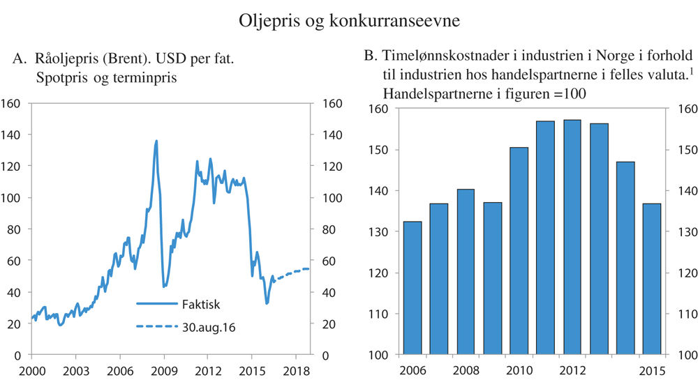 Prisene på olje og gass har falt betydelig siden sommeren 2014, se figur 2.1A. Økt produksjon og ny teknologi ser ut til å være de viktigste driverne bak nedgangen, men fallet i prisene på andre råvarer tyder på at også svakere vekst i etterspørselen har bidratt. At hovedvekten av prisfallet ser ut til å være tilbudssidedrevet, er positivt for norsk økonomi sammenliknet med et oljeprisfall forårsaket av et tilbakeslag i verdensøkonomien.