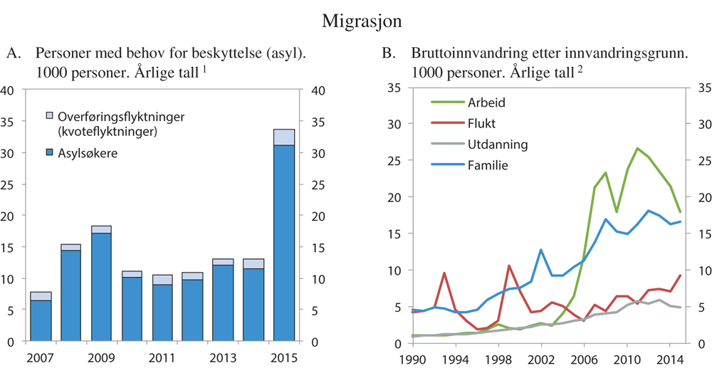 På sensommeren i 2015 endret migrasjonsbildet i Norge seg betydelig da det i løpet av noen få måneder ankom et stort antall asylsøkere. På årsbasis ble antallet asylsøkere nær tredoblet etter å ha ligget nokså stabilt de foregående fem årene, se figur 2.2A. Andre land i Europa opplevde en liknende utvikling, hvor tilstrømmingen av asylsøkere var særlig stor i Sverige og Tyskland. Fram til sommeren 2016 har asyltilstrømningen avtatt klart, men det er svært usikkert hvor mange som vil komme til Norge i resten av 2016 og i årene fremover. Parallelt med svakere vekst i norsk økonomi har det de senere årene vært en nedgang i arbeidsinnvandringen, selv om nivået fortsatt er høyt i historisk sammenheng, se figur 2.2B.