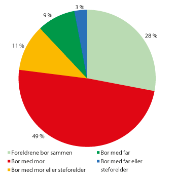 Barn og unge i barnevernet har oftere ugifte eller skilte foreldre enn andre barn. Bare 19 prosent av barn og unge i barnevernet har foreldre som bor sammen, mens andelen barn og unge generelt i Norge som har som har foreldre som bor sammen er på 75 prosent.10