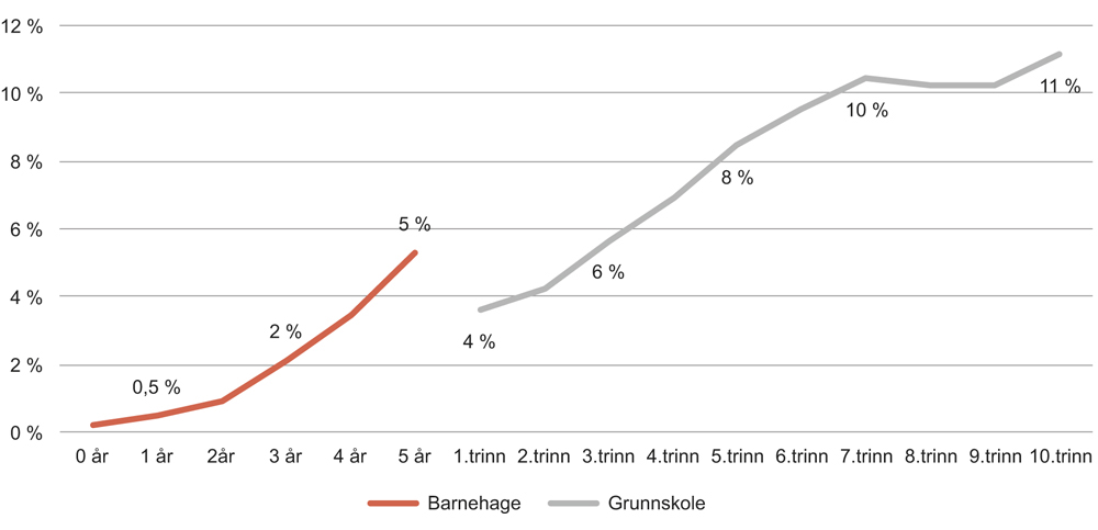 Andel av alle barn i barnehagen | 2,3 % | 2,3 % | 2,4 % | 2,7 % | 2,8 % |