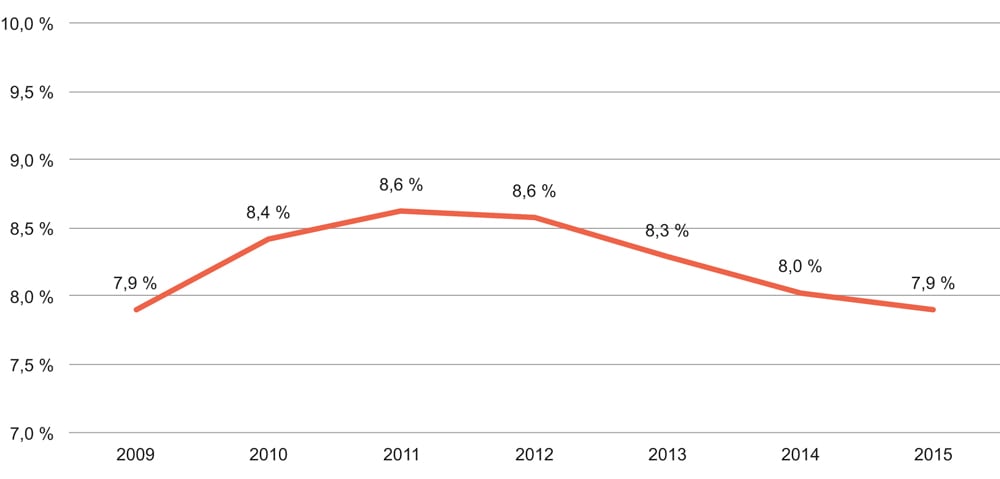 Tabell 8.1 viser utviklingen i prosentandel barn i barnehage som får spesialpedagogisk hjelp (2009–2014).